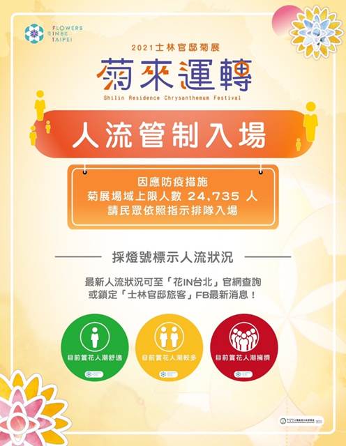園藝管理所賀綺華主任補充,因應新冠肺炎疫情,本次菊展採實聯制進場,入口處設有體溫監測系統,並架設電子看板即時更新園區人流,管控園區的總人數,以確保大家有個舒適安全的賞花環境,請大家有耐心的排隊進入士林官邸菊展,也請大家出門前先上2 0 2 1士林官邸菊展官網查看人流情形,若是呈現紅燈,建議大家再找其他時間再來賞菊哦!完善防疫措施,也希望大家期盼民眾到士林官邸能放鬆心情賞花,治癒身心靈。